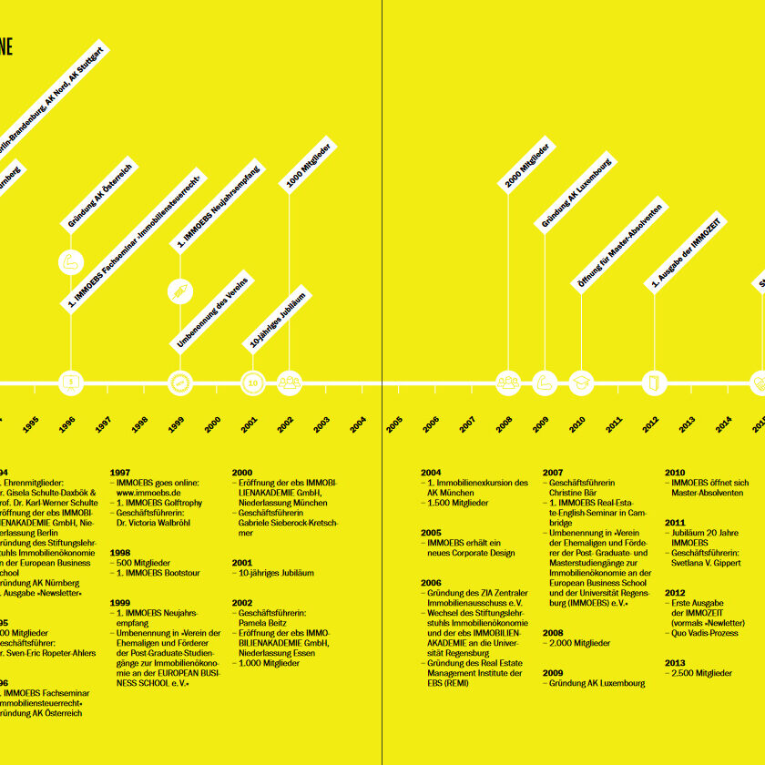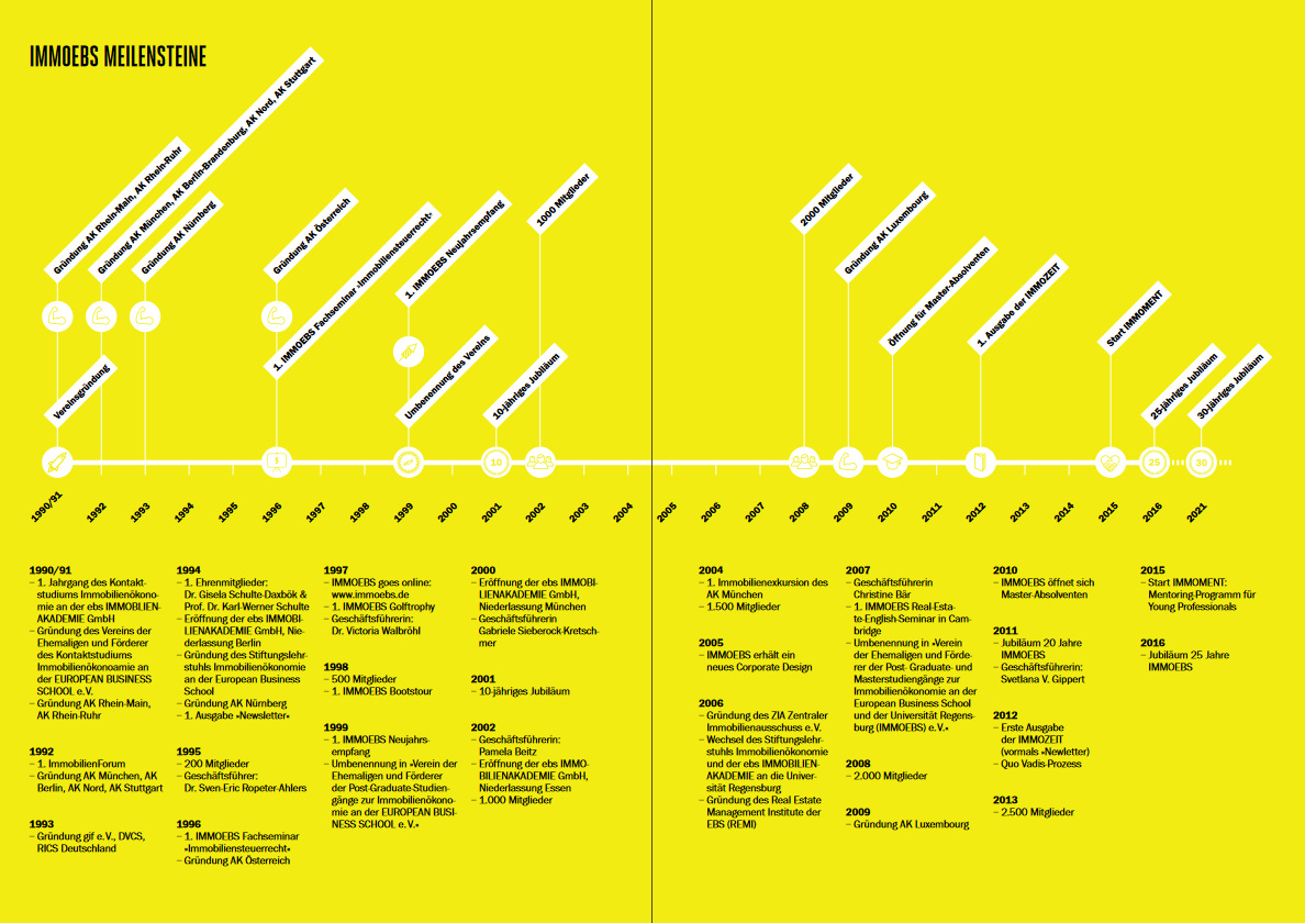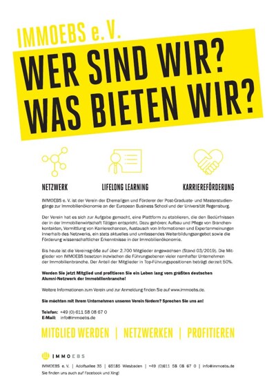 Auf Initiative und mit Förderung von Professor Dr. Karl-Werner Schulte wurde 1991 IMMOEBS von den Absolventen des ersten Jahrgangs des Kontaktstudiums Immobilienökonomie an der damaligen EBS Immobilienakademie gegründet, um die Kontakte zwischen den Studierenden über den Studienabschluss hinaus zu erhalten. Mit inzwischen 2.300 Mitgliedern und 9 regionalen Arbeitskreisen in Deutschland sowie Österreich und Luxemburg ist IMMOEBS das größte europäische Alumni-Netzwerk der Immobilienbranche.